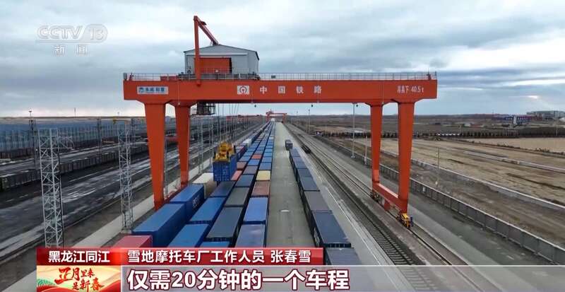 雪地摩托车厂工作人员 张春雪:工厂的产品从生产装车,到咱们对岸的是俄罗斯的下列宁斯阔耶口岸,仅需20分钟的车程。