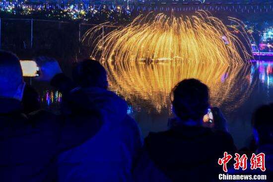 桂花湖畔民间艺人正在表演非遗技艺“打铁花”。