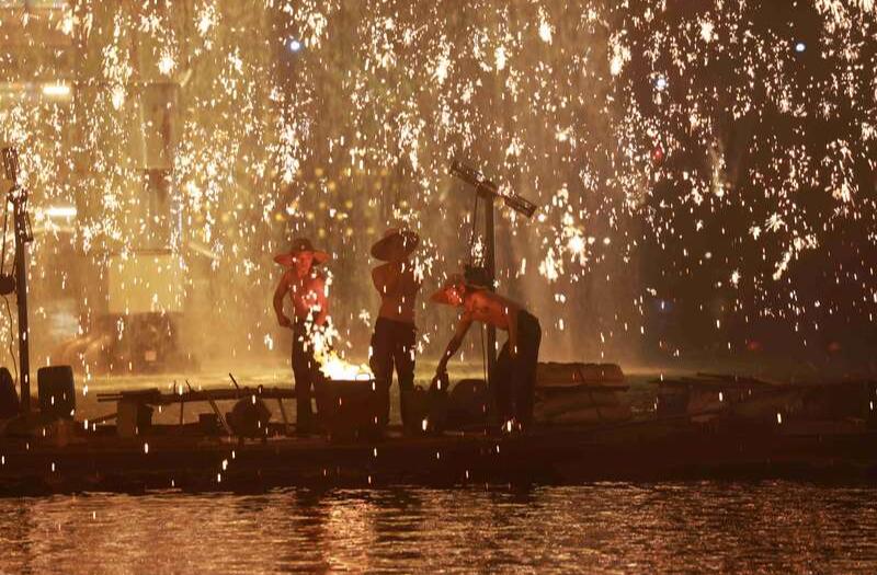 紧跟着两列纵队,穿着草鞋的梁山好汉们挨个登场,踩在散了一地的鞭炮红碎纸上,随“宋江”鼓点的轻重缓急,起舞、错身、敲槌、齐吼,有人动作不整齐,大哥“宋江”用鼓声提醒。他们要去大名府营救“卢俊义”。