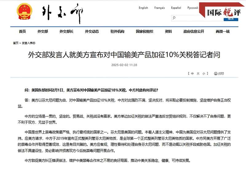 贸易战、关税战没有赢家;内病外治、甩锅推责解决不了美国的问题。希望美方客观、理性看待和处理自身芬太尼等问题,不要以此为借口祭出关税手段威胁他国。美方更应遵循基本的经济规律与常识认知,取消单边加征关税的错误做法,以负责任方式处理中美关系,为两国人民以及世界人民作出积极贡献。中美和则两利、斗则俱伤,这一历史经验将继续被事实证明。
