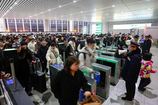 2025年2月4日,安徽省淮北火车站,旅客在排队检票。