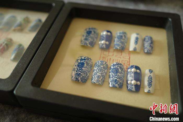 在武汉博物馆,一件青花缠枝莲纹葫芦瓶激发了杨帆的创作灵感。她用矿物质颜料调出瓷白色打底,用毛笔勾勒出青花纹样,耗费数天做成一幅浓翠的青花美甲。杨帆把成品分享在网络上,不仅引来众多问询,还有跨国公司寻求合作。