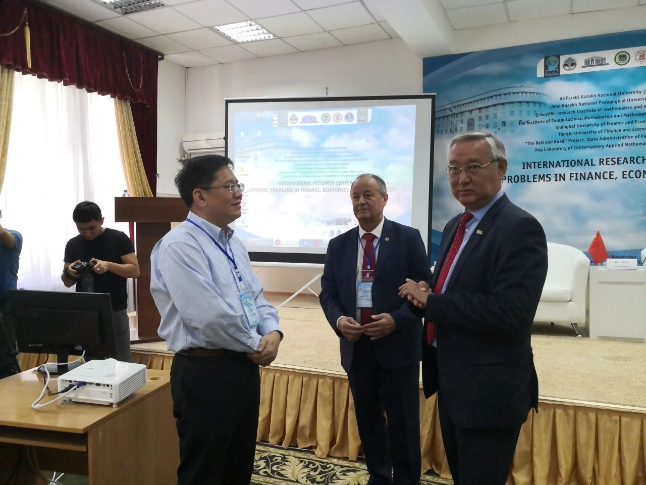 程晋(左一)在俄罗斯新西伯利亚参加国际会议和一带一路国际合作交流,与俄罗斯科学院通讯院士Kabanihkin等谈科研