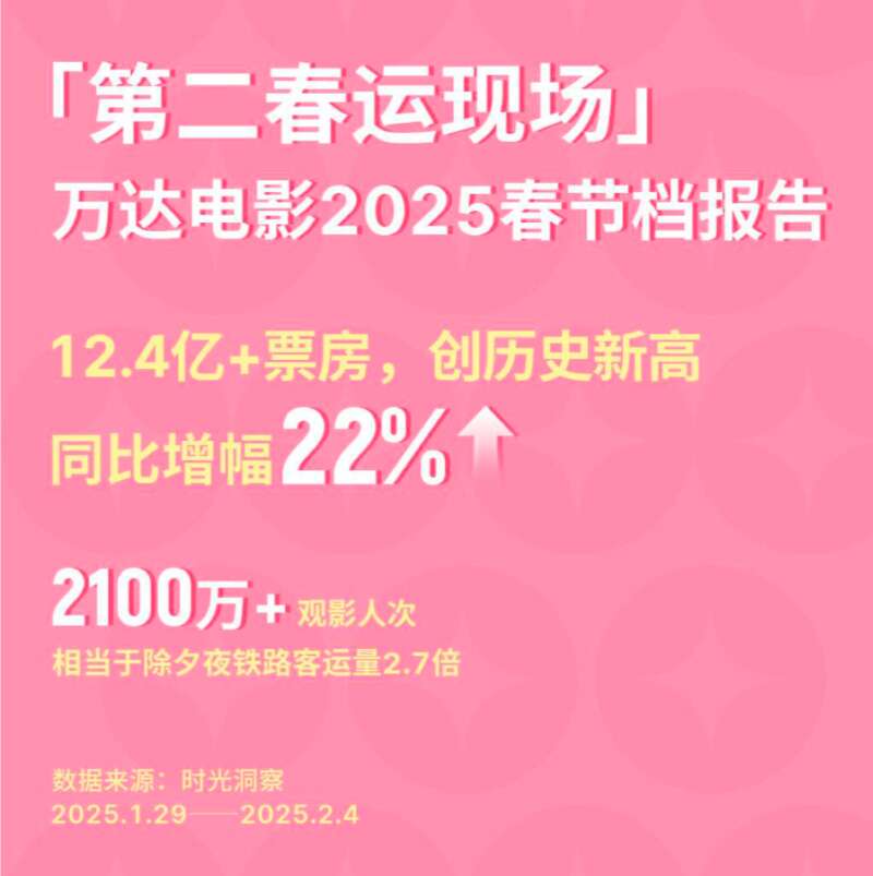 中国青年报客户端讯(中青报·中青网记者夏瑾)2月5日,记者从万达电影获悉,今年春节档,万达影城的票房创历史新高,超过了12.4亿元,同比增长22%。在过去7天里,超过2100万人次的观众选择到万达影城观影。春节观影不仅成为新年俗,“影院社交”也成为年轻人推崇的新型生活方式。“新年的第一场电影”成为Z世代打卡的新玩法。报告显示,大年初一一早便有超3000场次的放映,上座率超过了70%。