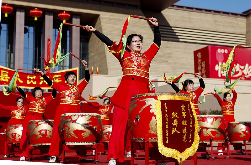 2025年2月4日,在山西省临汾市襄汾县陶寺遗址博物馆南广场,社火队员在为游客表演新春社火节目。