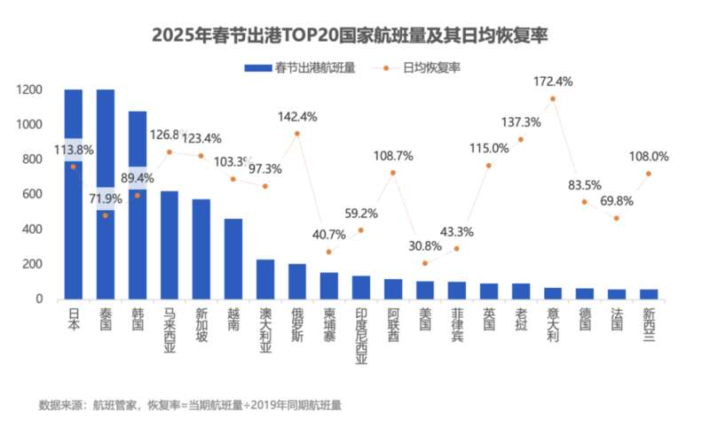 不过,目前的国际航线恢复仍未“满血”。根据航班管家的数据,2025年春节期间(1.28-2.04),民航国际出港客运航班7617班次,日均恢复至2019年春节的89.4%。通航国家69个,其中TOP20国家航班量占国际航班总量的92.1%,出港区域主要集中在东亚与东南亚,日本、泰国、韩国位列前三,恢复率上日本已超2019年水平,泰国恢复滞后,仅71.9%,除此之外,马来西亚、新加坡、越南、俄罗斯、阿联酋、英国、老挝、意大利、新西兰等国航班恢复率已超100%,美国航班的恢复率只有30.8%。