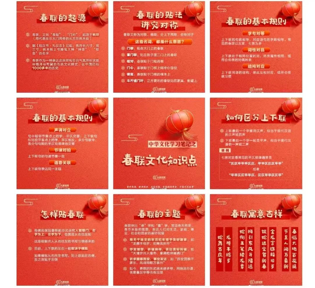 春联起源于古代的桃符,古人认为桃木具有辟邪的作用,于是用桃木制成木板,写上祈福的话语,悬挂在门上,以驱邪保平安。后来桃符逐渐演变成用红纸书写的春联,其内容也多有驱邪避凶的寓意。它是中国传统文化的重要组成部分,融合了书法、诗词、民俗等多种文化元素。通过贴春联,人们不仅能够欣赏到优美的书法艺术,还能感受到诗词的魅力,更好地了解和传承中华民族的传统文化。