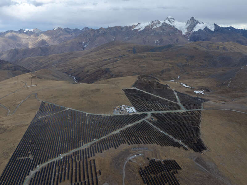 在海拔5000多米的山顶上,一块块光伏板沿着山势铺展,宛如与天空相接的湖泊,这些光伏组件在阳光的照射下熠熠生辉。
