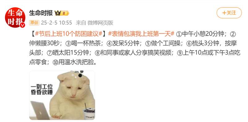 据中国蓝新闻,蛇年春节后的第一个工作日,你是否无精打采?专家建议开工第一天少干点活,不要给自己增加太大强度,否则可能会导致“退潮忧郁症”。