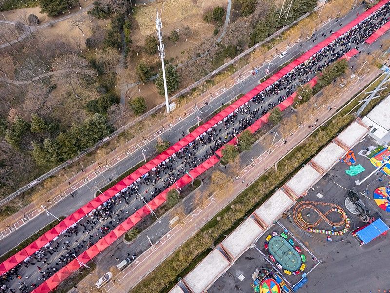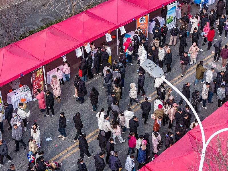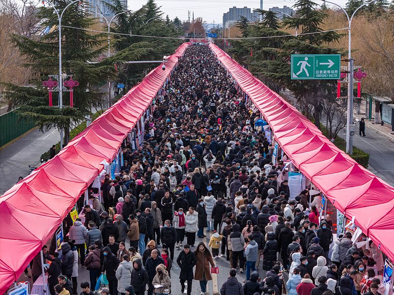 2025年2月5日,河南郑州,春节假期后首日,“郑州市2025年‘春风行动’启动仪式暨专场招聘会”在荥阳市京城路举办,600米长的市政道路封闭,路两侧搭建起帐篷,近400家企业提供3万多个岗位,据统计入场求职者达6万余人次、1.3万余人与企业初步达成就业意向,航拍视角壮观。