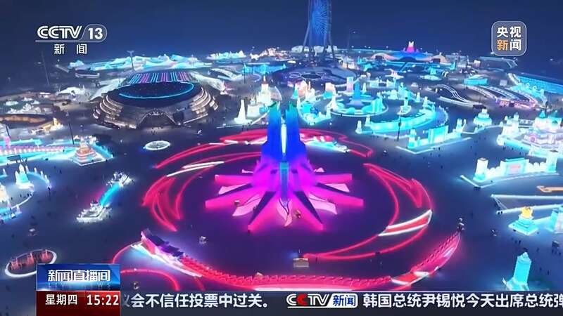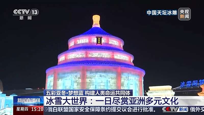 总台央视记者 赵晶:不必远行跋涉,一天之内就可以周游亚洲各地,启航一段精彩的文化之旅,这样的梦想在哈尔滨冰雪大世界就可以实现了,在我背后可以看到中国天坛,它是中国古代建筑艺术的瑰宝,用冰雕的形式来呈现,在天坛四周环绕式分布着亚奥理事会东亚区成员的标志性建筑。
