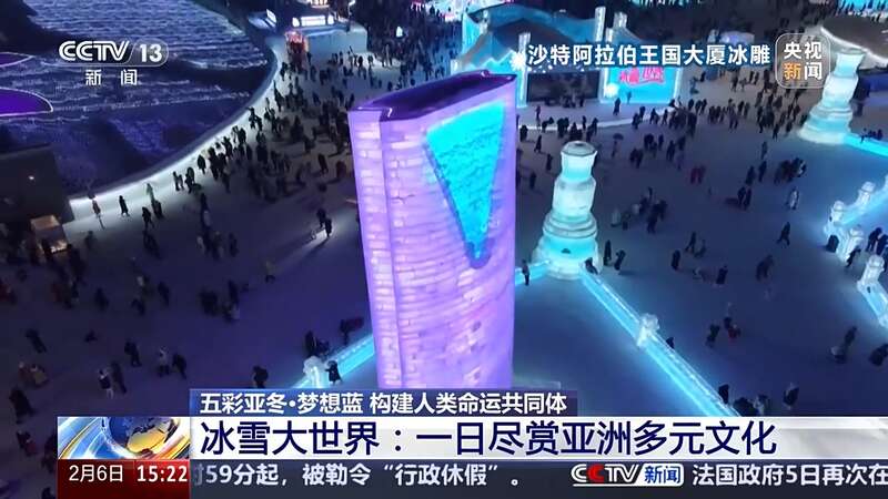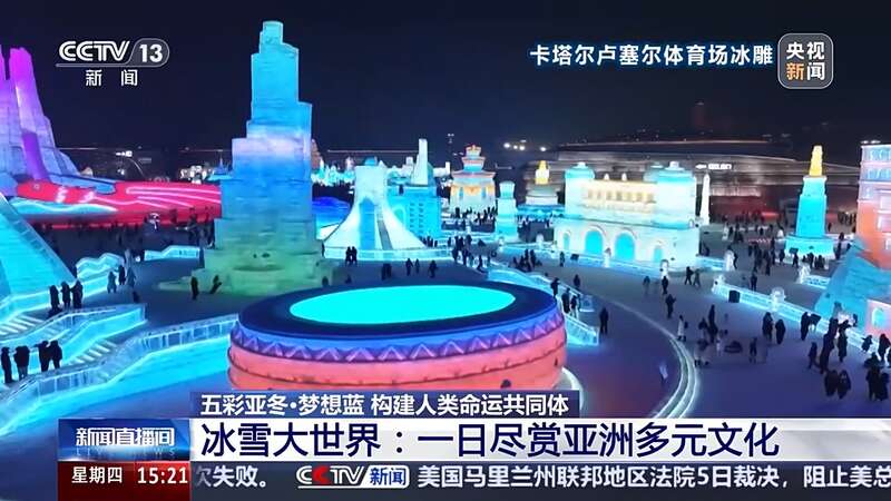 总台央视记者 赵晶:夜晚的冰雪大世界呈现出五光十色的美丽景象,在这里有一座名为“亚洲同心”的主塔,它不仅是一座凝固的冰雕建筑,也是亚洲团结、梦想与希望的象征。哈尔滨冰雪大世界也是哈尔滨亚冬会开幕式的分会场,让我们一同期待在这里的特别呈现。