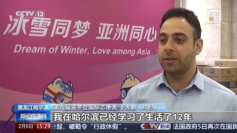 第九届亚冬会国际志愿者 王大鹏(约旦):我在哈尔滨已经学习了生活了12年,哈尔滨有很好玩的地方,也有很多美食,我喜欢吃锅包肉还有地三鲜,哈尔滨算是我的第二个家,所以我非常爱这里的文化和人民。我们都是准备好了。冰雪同梦、亚洲同心,我祝亚冬会圆满成功。