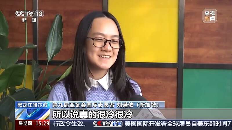 第九届亚冬会国际志愿者 刘诺依(新加坡):这是我第一次经历冬天,所以说真的很冷很冷,第一次看到雪也很漂亮,也很美。我们大家都很努力为亚冬会做准备,我也希望不管是运动员还是游客都能来到哈尔滨来一起体验这次的亚冬会。