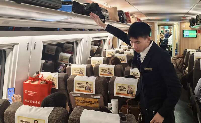 2月4日,天刚蒙蒙亮,上海虹桥站人头攒动,陈晶晶、葛浩楠拉着工作箱跟着乘务组穿过候车大厅。
