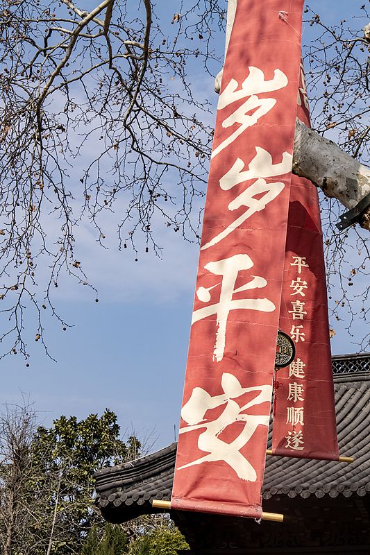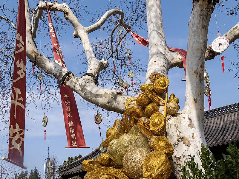 2025年2月5日,浙江杭州,钱王祠“陌上花开 迎春归”西湖迎春花展。会场中流动的金元宝造型和岁岁平安条幅。