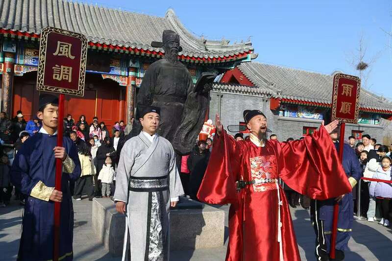 2024年春节,在第一届了凡公园新春文化庙会上,宝坻区首创推出了“了凡赐福巡游”沉浸式互动演出。今年,宝坻区进一步焕活名人IP,巡游2.0版增加了劝农、兴学、积善等多场沉浸式互动情景演出。以“了凡”之力,带领游客用脚步串起大型主题花灯展、美食文创市集、传统花会展演、评剧大鼓非遗表演等多个活动。不少青少年穿上汉服,走进庙会,用青春的活力诠释传统文化的魅力。