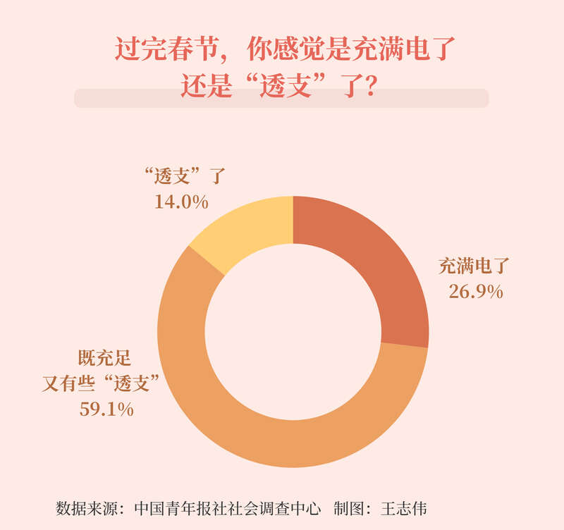 今年春节假期,你是如何度过的?是与亲友相聚、尝家乡美食,还是出门旅游放松心情、见识更广阔的天地,或是在家好好休息、给自己好好充个电?本周,中国青年报社社会调查中心联合问卷网(wenjuan.com)发布的一项有1002名受访者参与的调查显示,过完春节假期,26.9%的受访者感觉自己充满电了,14.0%的受访者直言“透支”了,还有59.1%的受访者感觉过得既充足又有些“透支”。