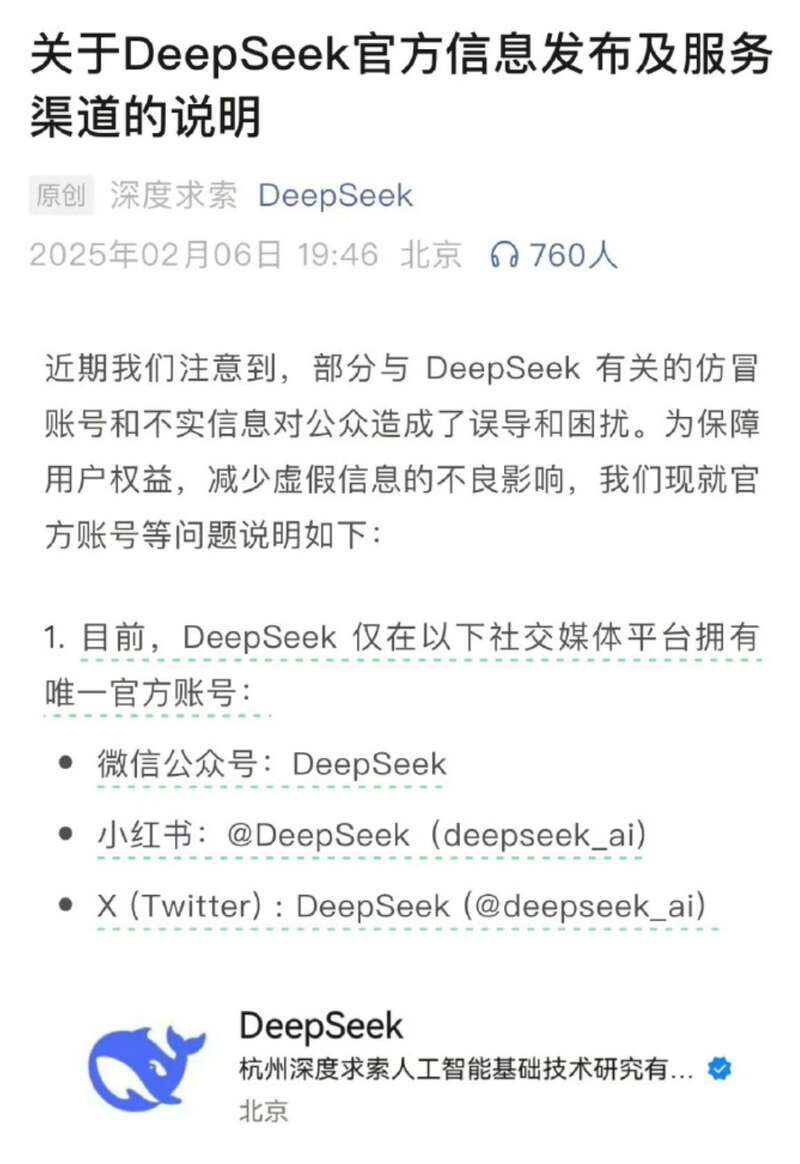 近期发现了一些与其有关的仿冒账号和不实信息,这些行为对公众造成了误导和困扰。DeepSeek呼吁用户警惕仿冒账号和不实信息,确保只通过官方渠道获取信息。