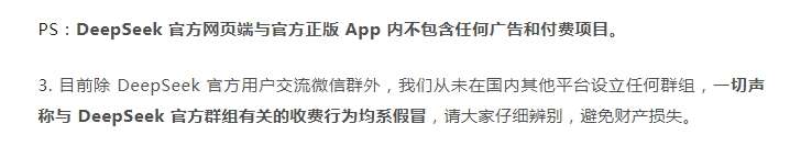 目前除 DeepSeek 官方用户交流微信群外,从未在国内其他平台设立任何群组,一切声称与 DeepSeek 官方群组有关的收费行为均系假冒。