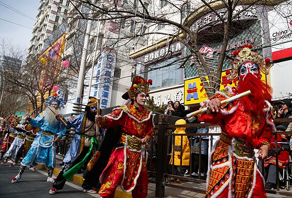 2025年2月7日,来自广东省揭阳市的英歌舞首次亮相青海西宁,参与优秀社火集中巡游活动。身着英歌舞服饰的青少年,跟随节奏起舞,与历史悠久的青海社火进行了一场“对话”。图为潮汕英歌舞表演现场。 中新社记者 马铭言 摄