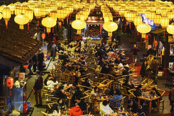 2025年1月26日,成都东门市井灯会现场,民众坐在灯笼下喝茶吃火锅赏花灯,在充满人间烟火气的市井小巷里,感受浓浓年味。