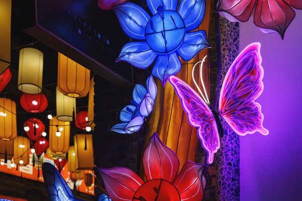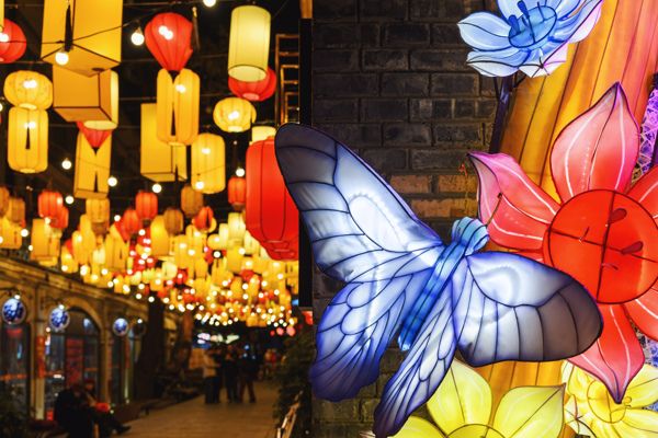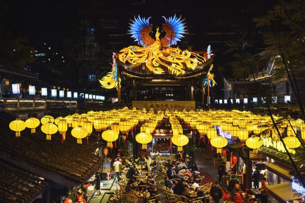 成都:东门市井年味浓 民众灯下吃茶赏花灯