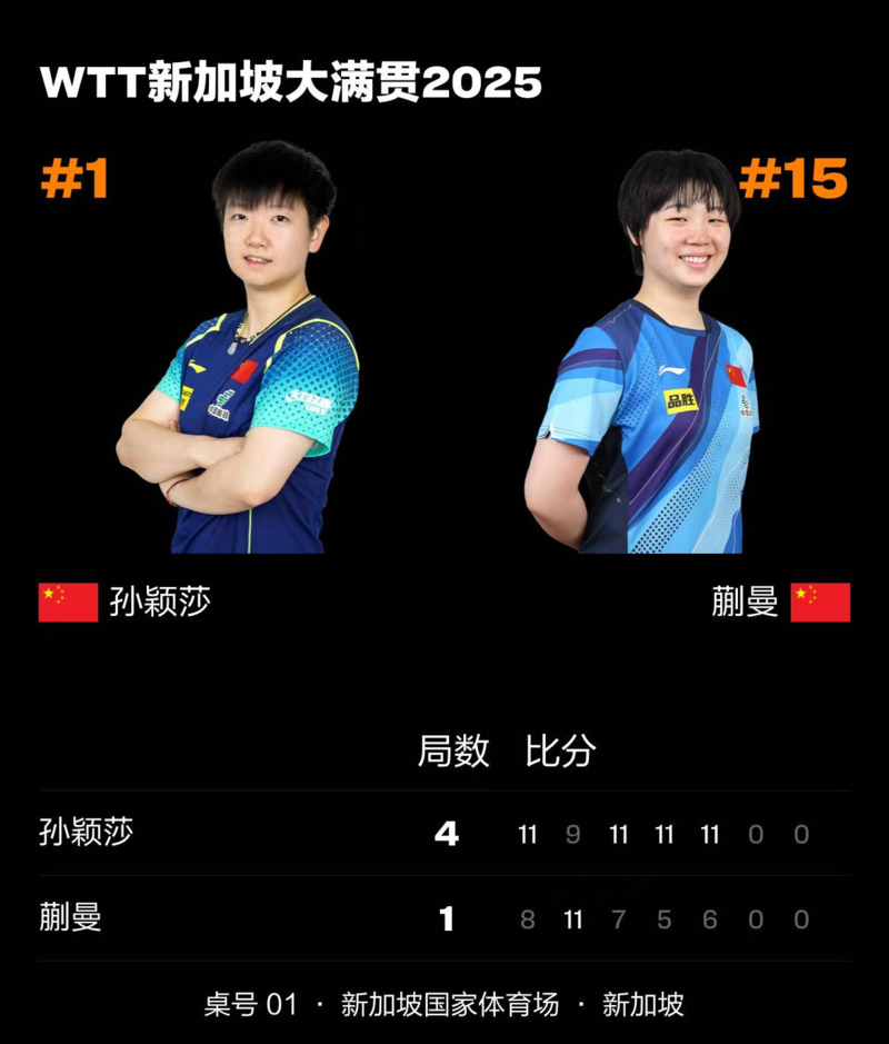 2月9日,WTT世界乒联新加坡大满贯迎来收官日。在刚刚结束的女单决赛中,中国队选手孙颖莎4-1战胜队友蒯曼,夺得冠军。中国队在本届赛事包揽了女单四强。