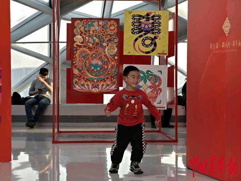 2月10日,北京通州一家购物中心内,2025年“新生活·新风尚·新年画”美术创作展示活动通州主展区在此开展,一名小观众在年画展中嬉戏。中青报·中青网记者 田嘉硕/摄