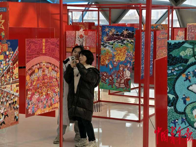 2月10日,北京通州一家购物中心内,2025年“新生活·新风尚·新年画”美术创作展示活动通州主展区在此开展,一名观众用手机拍摄喜爱的年画作品。中青报·中青网记者 田嘉硕/摄