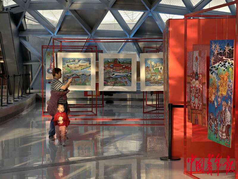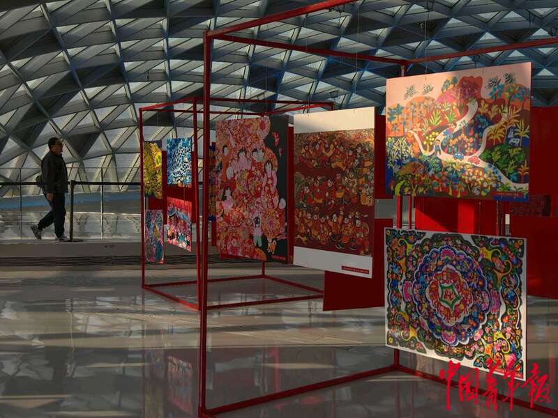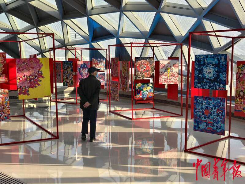 2月10日,北京通州一家购物中心内,2025年“新生活·新风尚·新年画”美术创作展示活动通州主展区在此开展,一名市民从画展旁走过。中青报·中青网记者 田嘉硕/摄