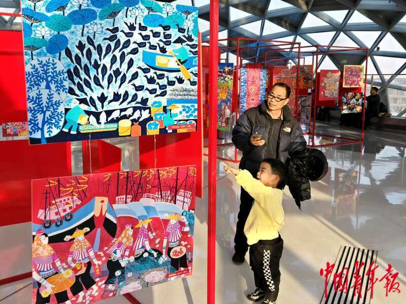 2月10日,北京通州一家购物中心内,2025年“新生活·新风尚·新年画”美术创作展示活动通州主展区在此开展,一对父子正在观赏年画。中青报·中青网记者 田嘉硕/摄
