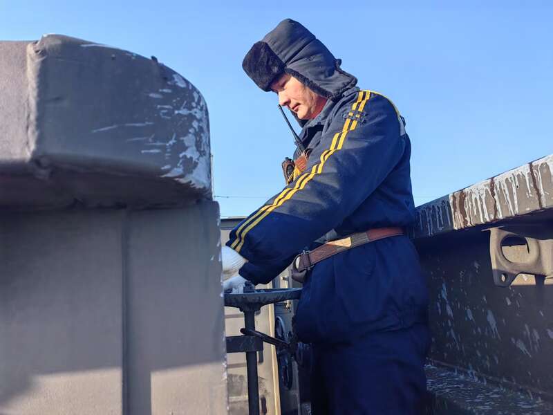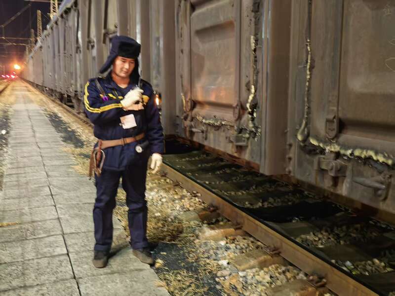 随后,陈凯旋给两个伙计分好工,三人在各个车辆间来回穿梭,不停地弯腰、起身,将货位上车辆的制动软管摘开,把卸空后车辆的制动软管再接上……不一会儿,陈凯旋和伙计们的身上已经开始冒汗,这样简单的动作,他们一个班下来要重复150多次。而这些动作和流程,都是调车作业的家常便饭。