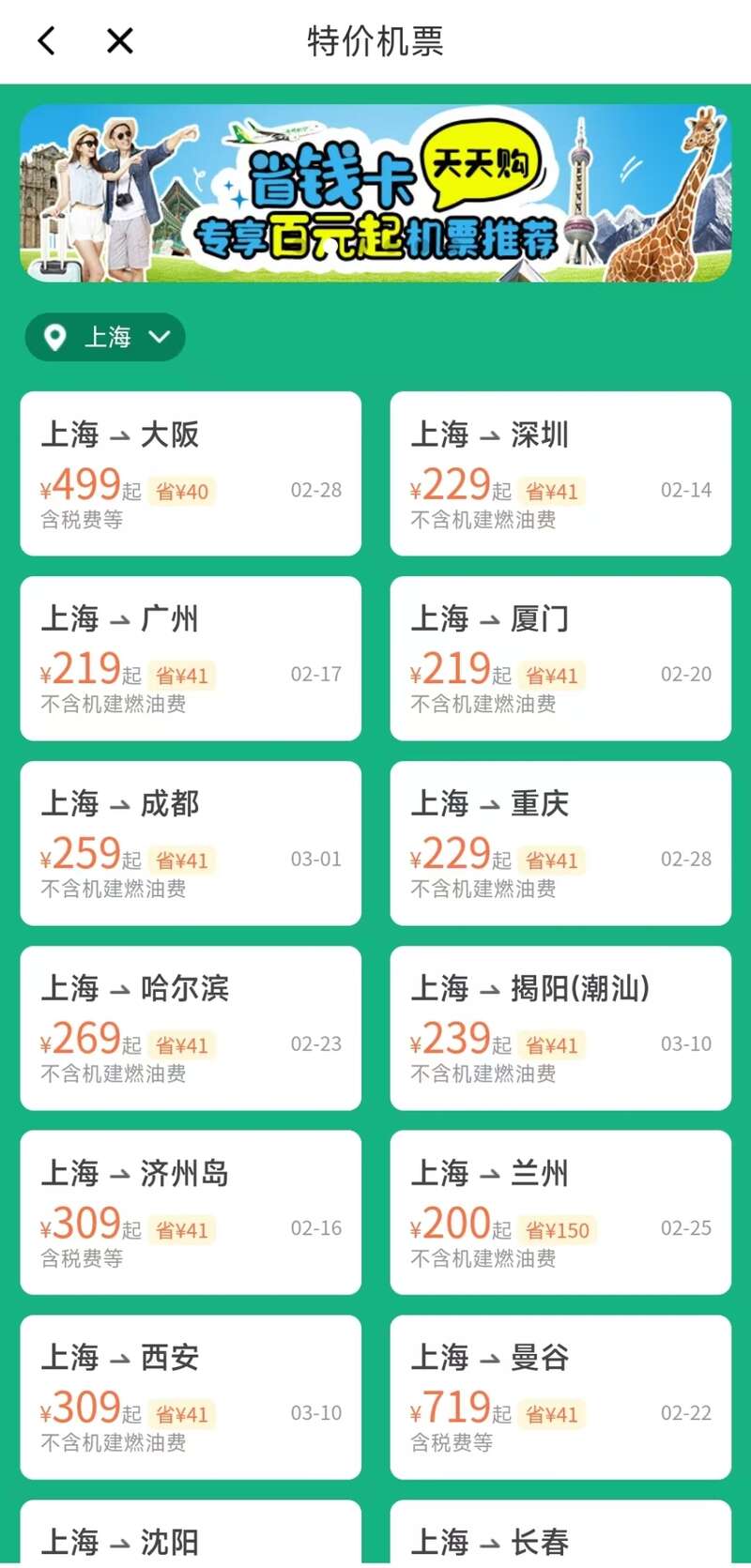 不过,多家航司的特价机票未见低于200元的票价。记者在春秋航空App搜索特价机票显示,从上海出发成都、深圳、广州、厦门等全国多地的价格均为200元以上,如上海2月14日飞往深圳的早间7:30的航班价格为229元。记者更换了多个出发地搜索,价格均未见到200元以下的。