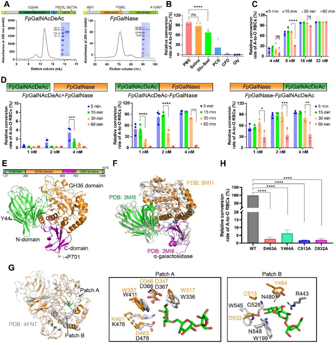 该研究证明,在优化的孵育条件中,N-乙酰半乳糖胺脱乙酰酶(FpGalNAcDeAc)和半乳糖胺酶(FpGalNase)可有效、协同地将A型RBC转化为O型RBC,在低浓度酶(16 nM)条件下,仅5分钟就可实现高于99%的转化率。