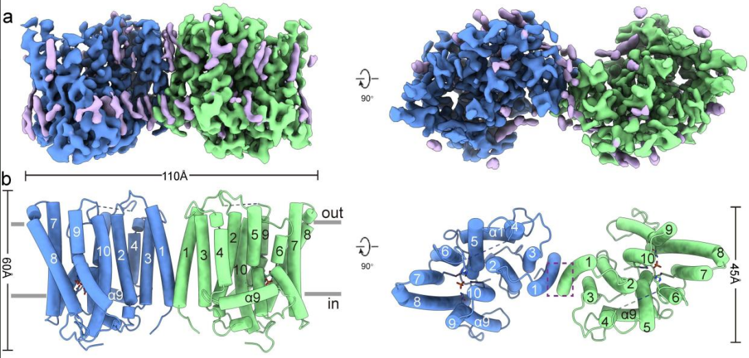 磷在各种生物体内都是必不可少的,对维持生命活动至关重要。在细胞水平上,Pi的摄取与外排是由特定的转运蛋白来介导的,它们协同作用来维持细胞内的Pi平衡;细胞内Pi浓度失衡可引起一系列人类疾病,比如佝偻病、心血管疾病、骨软化症等。在脊椎动物中,SLC20 和 SLC34 等蛋白家族的成员负责将Pi摄入细胞内。相比之下,参与细胞 Pi 外排的蛋白则知之甚少,XPR1 及其同源蛋白是目前唯一被报道参与 Pi 外排的蛋白。XPR1 功能异常与家族性脑钙化(PFBC)、血栓等疾病相关,同时 XPR1 还可作为舌鳞状细胞癌的诊断标志物。XPR1由一个具有多个跨膜螺旋的跨膜结构域和一个位于胞质内的SPX结构域。有研究表明, SPX 结构域能够感知细胞内肌醇焦磷酸(PP-InsP)水平,从而调节细胞对Pi的摄取、储存和利用。除了单独SPX结构域的晶体结构外,此前关于XPR1的结构信息仍较少。同时,XPR1 是否为Pi外排蛋白以及其如何外排Pi,仍然悬而未决。