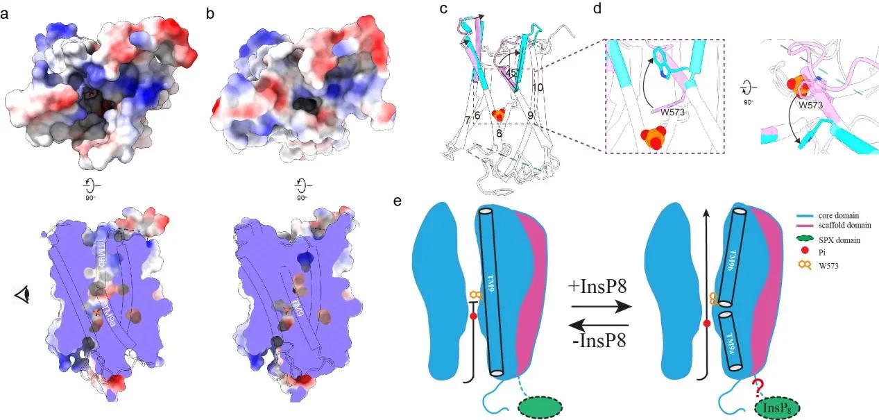 在核心结构域中,各TM围成一个桶状结构,在其内形成一个连续的离子转运通路。在离子转运通路的最窄处(通路中心靠近细胞内侧),形成了Pi的结合位点,从而将该通路分隔成胞内前庭(IV)和胞外前庭(EV)两部分。有研究表明,在PP-InsPs合成受阻的情况下,动物细胞中的 Pi 外排水平较低,表明 XPR1可能受PP-InsPs激活打开。与之相符的是,PP-InsP结合位点突变体XPR13mut 的EV处于闭合状态,而XPR1WT的EV则处于开放状态,主要是由TM9 和 W573 侧链的结构变化来引起的。这些结构研究的结果表明,XPR1的工作原理更接近于离子通道。