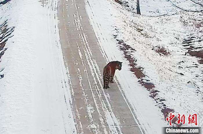 2月9日,在和龙市崇善镇广坪村,东北虎在路上行走。(视频截图) 吉林延边边境管理支队和龙边境管理大队供图