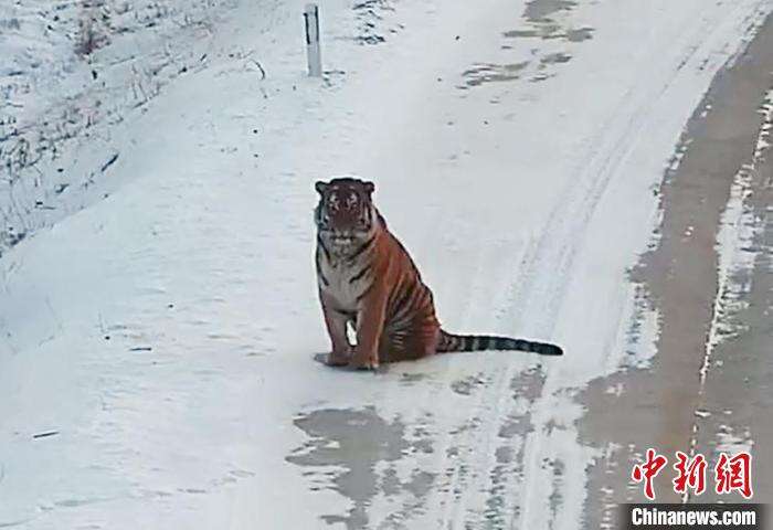 2月9日,在和龙市崇善镇广坪村,东北虎坐在路旁。(视频截图) 吉林延边边境管理支队和龙边境管理大队供图