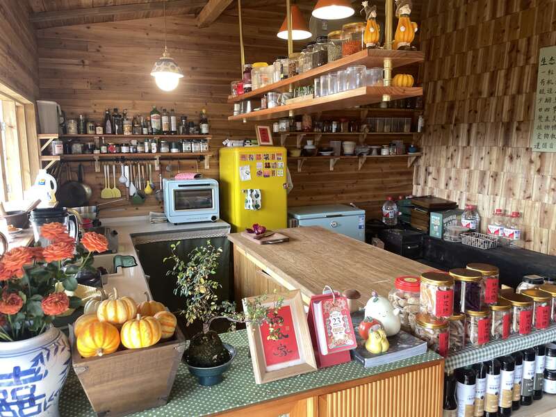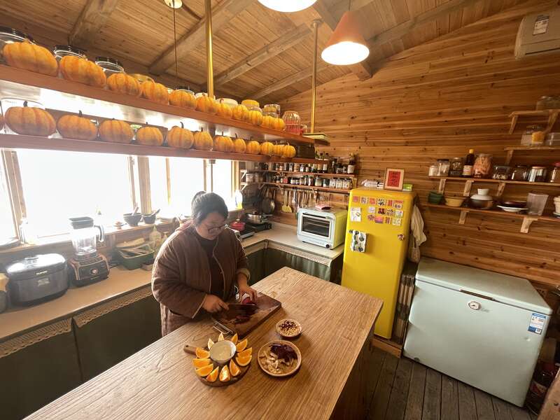 封玲所说的山,与其说是山,不如说是一处山坡。山坡上,阳光、微风、鸟叫、果香,大自然的一切美好紧紧包裹着这间木屋。木屋内,宽敞的开放式厨房与各式各样的料理器具时刻提醒着参观者,这里的主人对于打造一间专业厨房的野心。一旁,各类有机食材被整齐码放在木制置物架上。角落里,黑色壁炉里的木炭烧得火红,偶尔发出兹拉的声响,一切都是刚好的温馨与和谐。