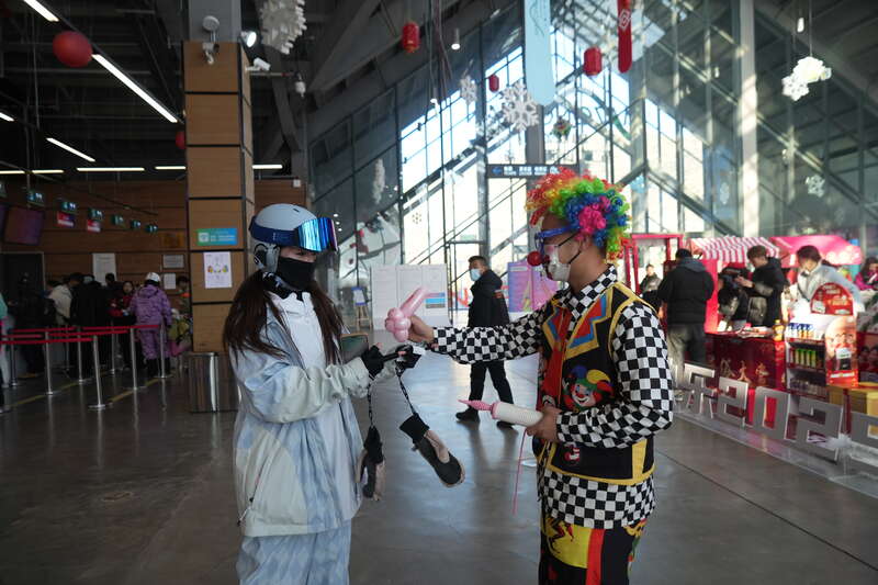 雪具大厅里早被装点得年味浓浓,红色的主题墙,喜庆的音乐,一派勃勃生机。大厅里人头攒动,王妙生拿着扫把和簸箕在自己负责的区域来回巡视。透过大厅玻璃向远处的山脉望去,身着鲜艳雪服的雪友在雪道上尽情飞驰,雪服和头盔上的彩色带子迎风飞舞。“我要是年轻几岁,也和他们一起玩儿去。”王妙生乐呵呵地说。
