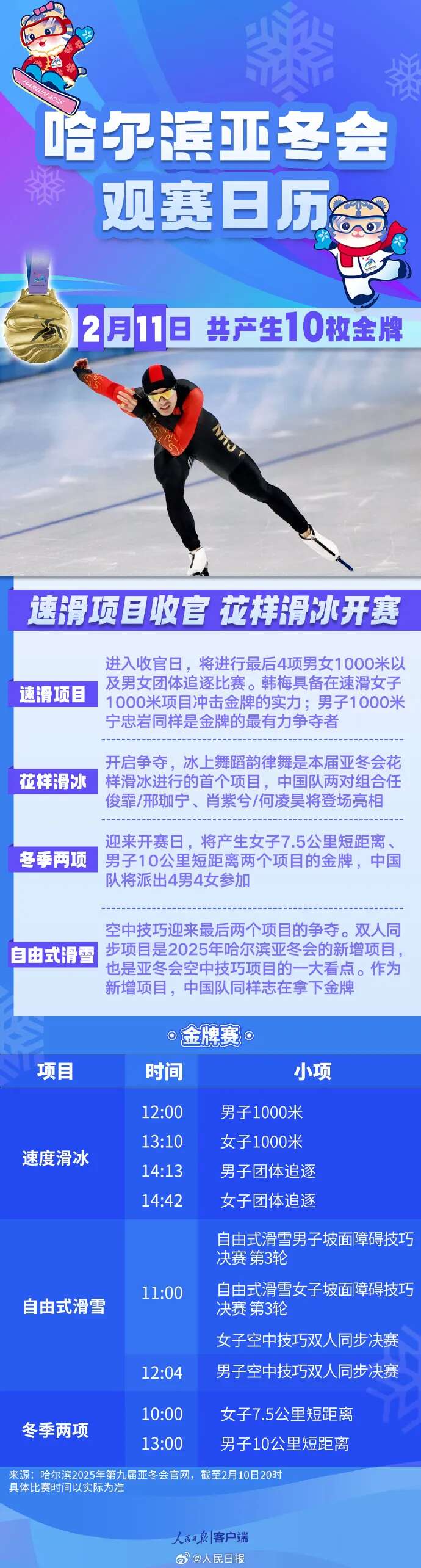 据人民日报,2月11日,速滑项目进入收官日,将进行最后4项男女1000米以及男女团体追逐比赛。花样滑冰开启争夺;冬季两项迎来开赛日;自由式滑雪迎来最后两个项目争夺。一起期待↓↓