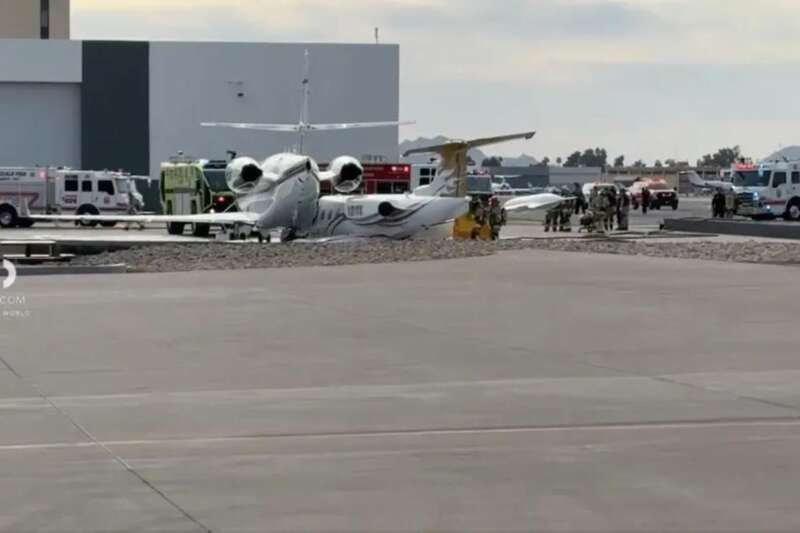 当地时间10日14时45分左右,美国亚利桑那州斯科茨代尔机场两架飞机在地面跑道发生碰撞。目前紧急救援人员已赶赴现场,该机场的跑道已关闭。(央视记者 许骁)