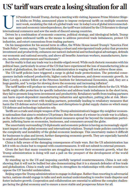上周五,美国总统特朗普在会见到访的日本首相石破茂时宣布,下周将向多个国家征收“对等关税”。由此,全球贸易战风险升级。当今,世界互联互通,经济相互依存,美国发起的关税战或将扰乱国际贸易,使得各国心生间隙。