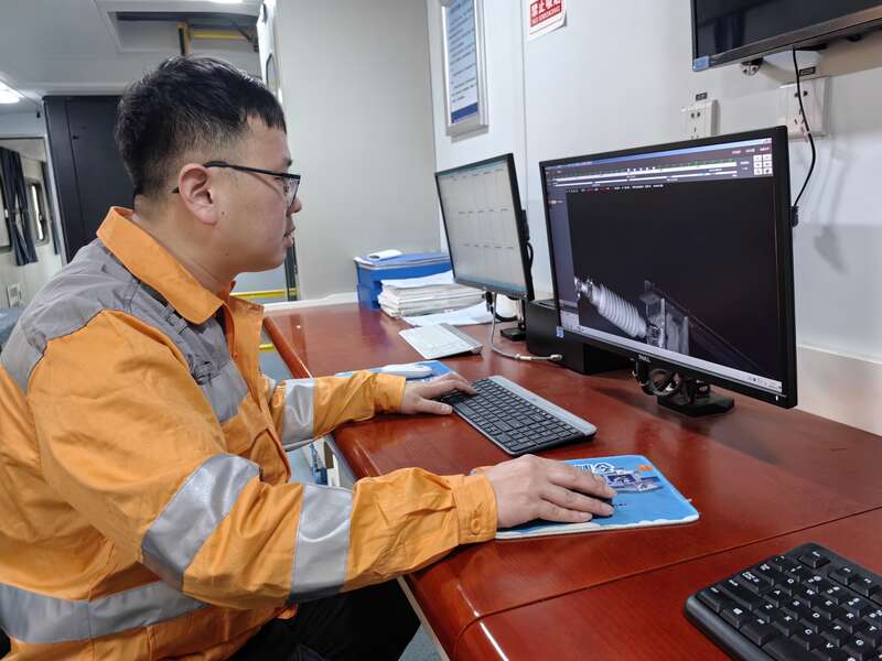 23时15分,检测车驶上线路,检测工作正式开始。随着车顶LED频闪补偿光源发出的闪光,监控屏幕上同步呈现沿线接触网部件图像。此时,葛烨全神贯注地紧盯着回传的照片和视频,不敢有丝毫懈怠。