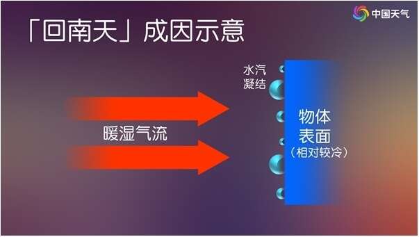 于群解释,回南天的出现是冷空气过后,暖湿气流迅速反攻,导致气温回升,空气湿度加大。冷空气造成的低温物体表面遇到暖湿气流时,水汽凝结成水珠,就形成回南天了,一般在华南沿海更常见。