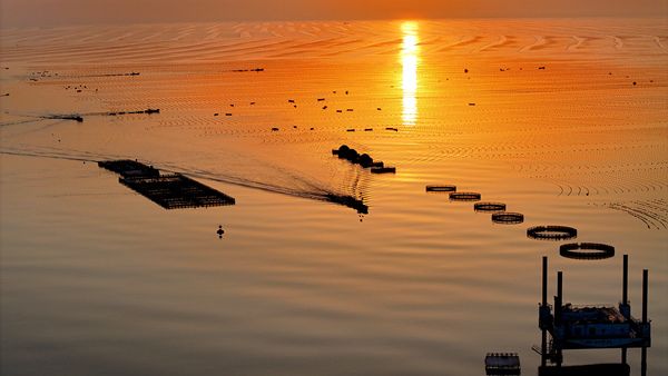 山东荣成:金色朝霞洒落海带养殖区 海洋牧场早春“耕海”一派繁忙