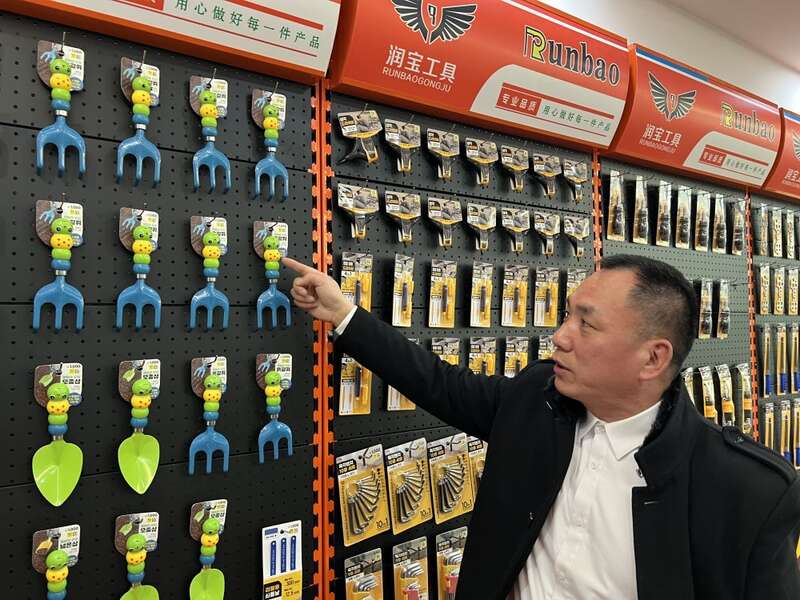 重庆市大足区润宝工具制造有限公司董事长侯亿林向记者介绍面向国际客户的五金产品。新华社记者 周文冲 摄