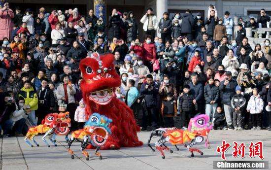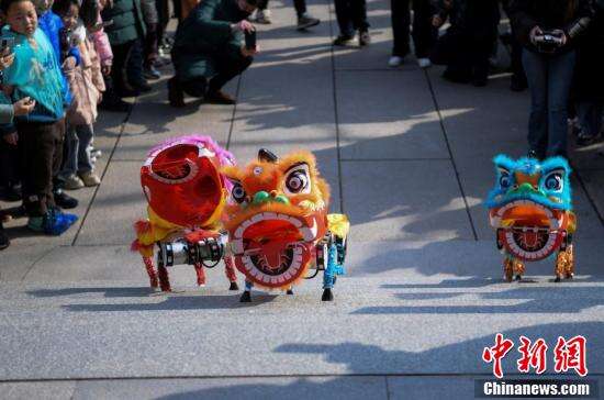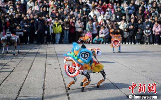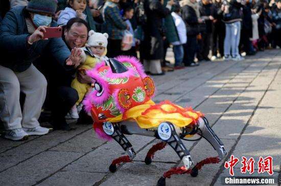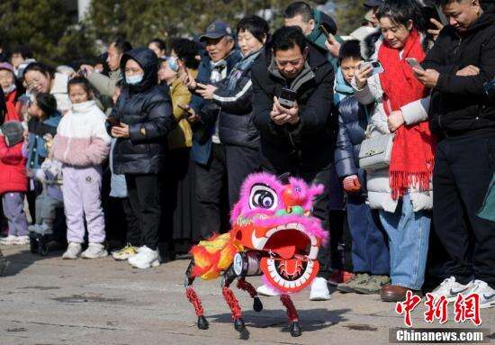 2月12日,农历正月十五元宵节,机器狗舞狮亮相山东济南大明湖畔,吸引游客驻足欣赏。图为机器狗身披舞狮服装与舞狮队员共舞。