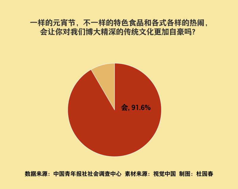 一样的元宵节,不一样的特色食品和各式各样的热闹,调查中,91.6%的受访者表示这让自己对我国博大精深的优秀传统文化更加自豪。